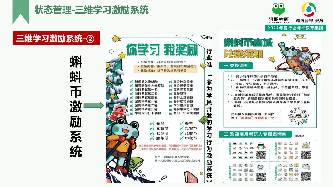 为了激发学员学习乐趣,给与学员学习持久动力,研趣行业首创了“三维学习激励系统”。研趣技术团队和文创设计团队为学员源代码开发了“量化积分管理系统”“蝌蚪币激励系统”“蝌蚪币商城”三大系统。