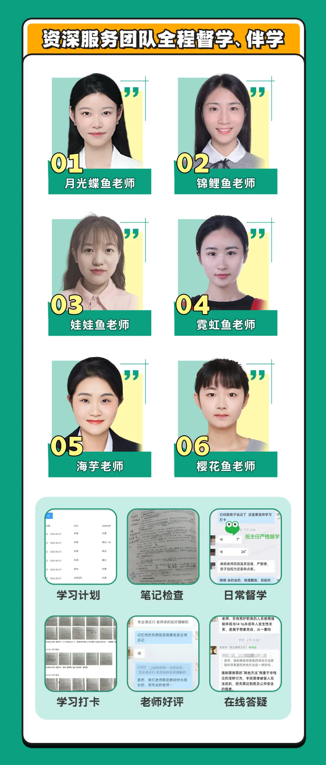 2.全流程督学伴学:研趣会为每一位学员匹配班主任,在考研学习的全过程督学伴学,制定学习计划、督促学习打卡、安排阶段测试、发放图书资料、带背抽背等。