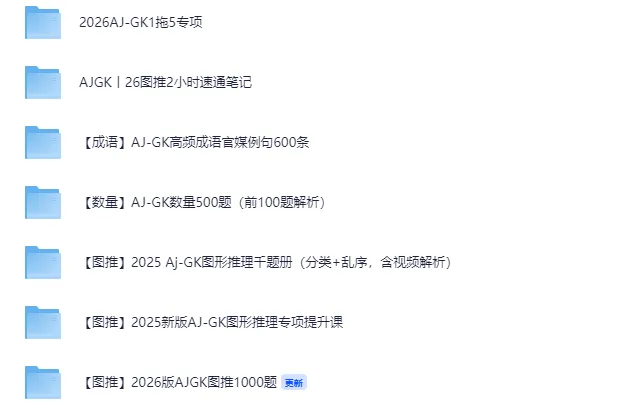 2026AJ-GK1拖5专项链接:https://pan.quark.cn/s/391f8e343834链接:https://pan.quark.cn/s/418ba6590faf链接:https://pan.quark.cn/s/4a250cca4712链接:https://pan.quark.cn/s/e8a6591fe7a1链接:https://pan.quark.cn/s/9ca343478cd2链接:https://pan.quark.cn/s/504d15450dc1链接:https://pan.quark.cn/s/15fa321b952f【图推】2025 Aj-GK图形推理千题册(分类+乱序,含视频解析)链接:https://pan.quark.cn/s/82e5fd459308链接:https://pan.quark.cn/s/35683a4d40b4AJ-GK资料总链接:https://pan.quark.cn/s/c2e73b7a8013所有资料均免费分享,建议将本公众号设为置顶标星★,可第一时间收到更新