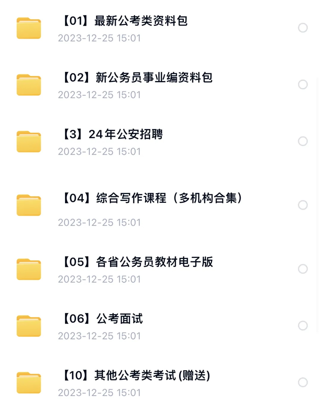 公考省考国考资料给大家放到了百度网盘群中,大家在公众号主页直接回复关键词【考公资料】即可直接领取~资料包含24已完结的省考和国考资料,后续还会给大家分享更新的25资料。请在公众号主页回复关键字【考公会员】获取领取资源方式,以上资源也都是在不断更新维护的!【免责声明】所有资料均整理自网络,仅用于个人学习交流使用,不得用于商业用途,请在下载24小时内删除,如有侵权你的权益,请联系菜单栏微信。