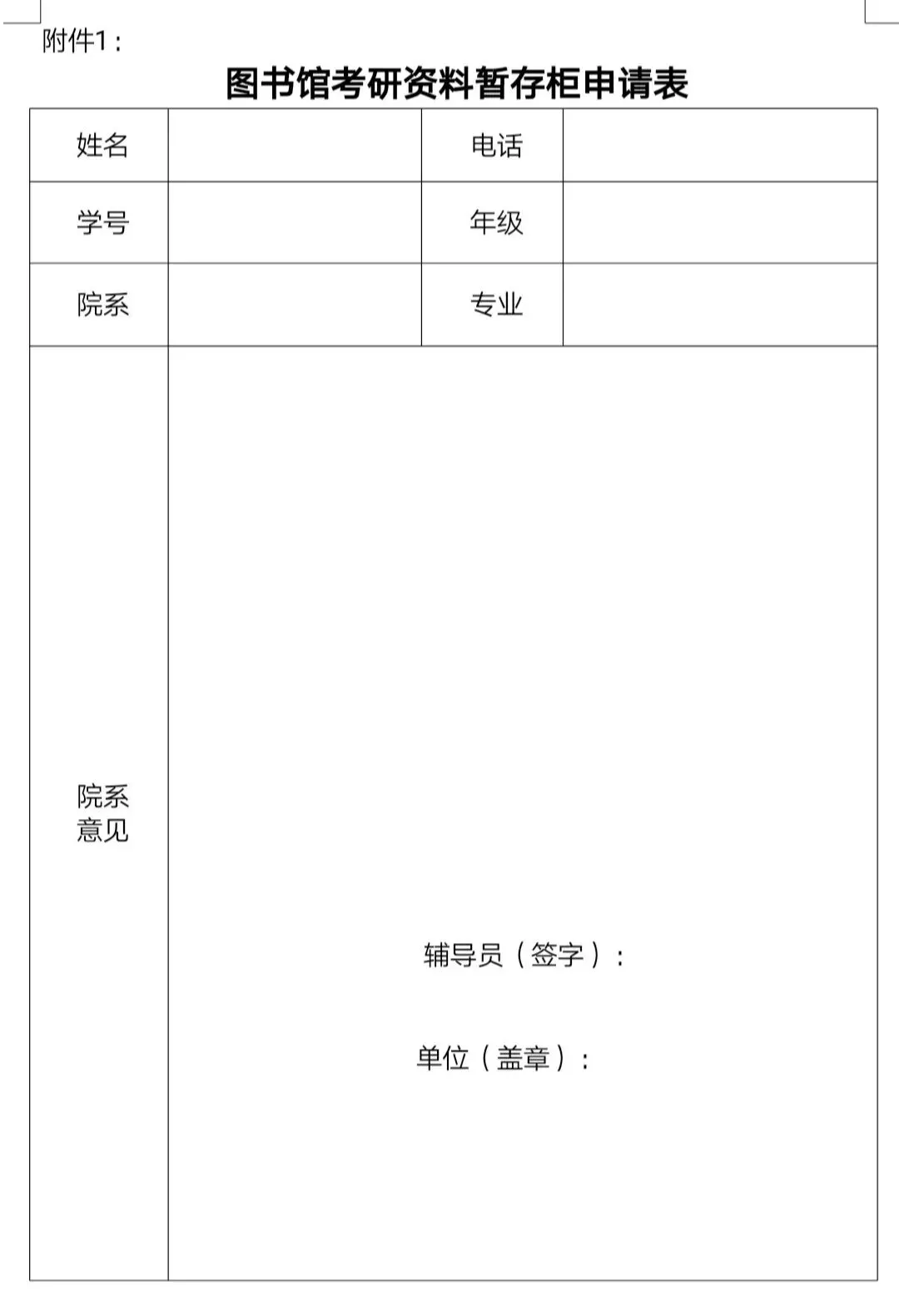 1.请自行下载《图书馆考研资料暂存柜申请表》(附件1,以下简称申请表),填写并由所在学院签字盖章。下方获取申请表 ↓↓↓