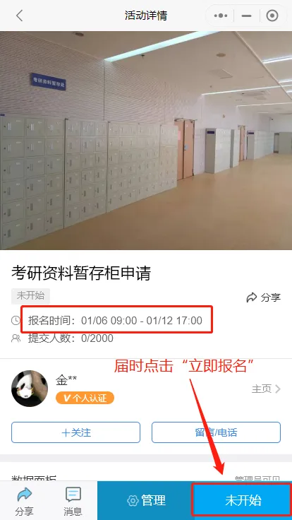 2.通过扫码,进入微信报名小程序,填报个人姓名、年级、专业等信息,并上传本人证件(学生证或校园卡)和由所在学院签字盖章的《图书馆考研资料暂存柜申请表》照片,待审核后,会通过微信收到报名审核通知。详细指南请阅读下方申请指引↓↓↓