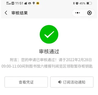 3.领取钥匙时间为2022年2月28日至3月1日09:00-11:00,14:00-16:00。为避免人员聚集,审核通过者,需携带本人证件(学生证或校园卡)及申请表原件,按照反馈信息中的时间和地点到图书馆相应楼层咨询台领取暂存柜钥匙。在此期间未领取钥匙,视为放弃。