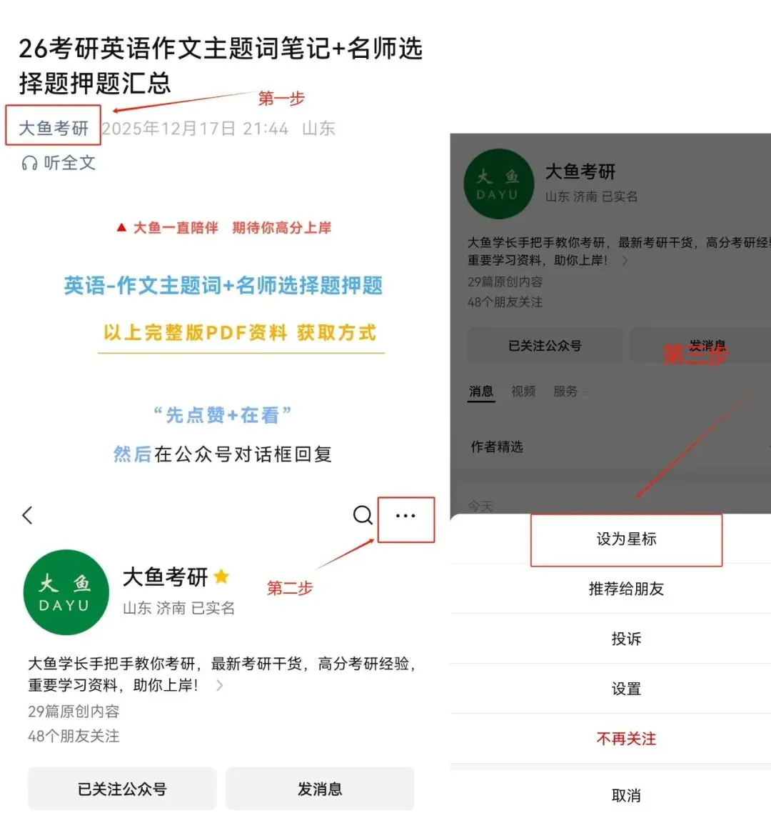 解决的方法就是:星标公众号,或者看完文章后记得点个“赞+在看”,就可以更快得收到本号的最新文章啦!(不会星标的同学,看下图!)