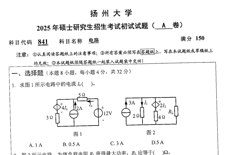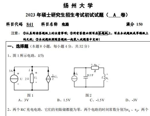 2014-2025年扬州大学841电路考研真题试卷