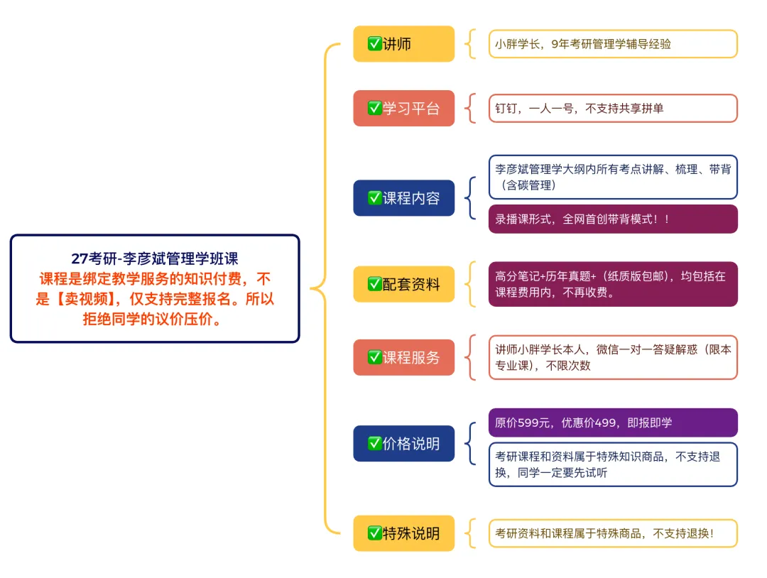 课程形式为钉钉群录播课,包括李彦斌管理学所有考点的带背讲解(含碳管理学部分),初试全程答疑解惑。