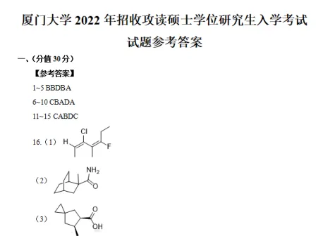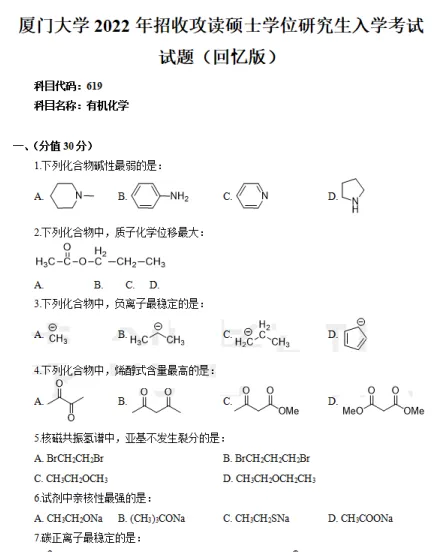 1999-2022年厦门大学619有机化学考研真题试卷(不含07/19)2007-2022年厦门大学619有机化学考研真题参考答案
