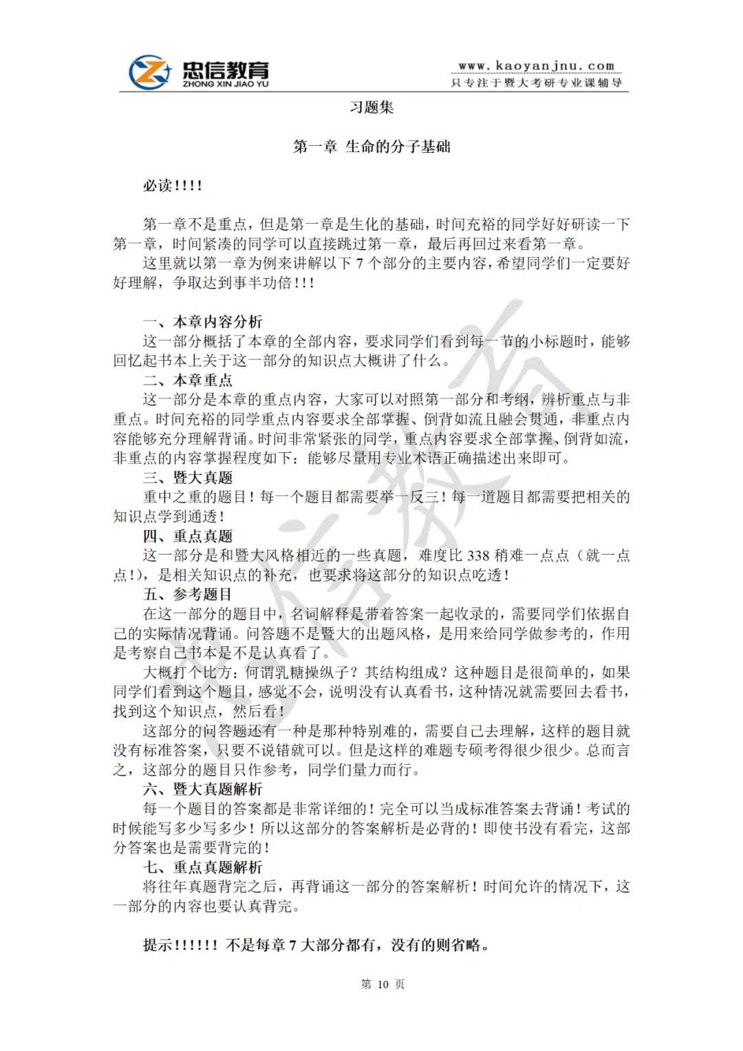 2.蓝宝书适用于报考暨大生科院所有专业的学生,在考研各阶段均有重要作用。前期助力构建知识体系、掌握考点;中期辅助知识点记忆;后期用于研究真题、查漏补缺。最佳使用方式是先认真浏览专业课本,第一遍无需刻意记忆所有知识点,有印象即可。阅读完课本后再看蓝宝书,能更轻松抓住重点与考点,避开非重点内容。蓝宝书逻辑清晰,知识点分节分点罗列,便于记忆与理解。