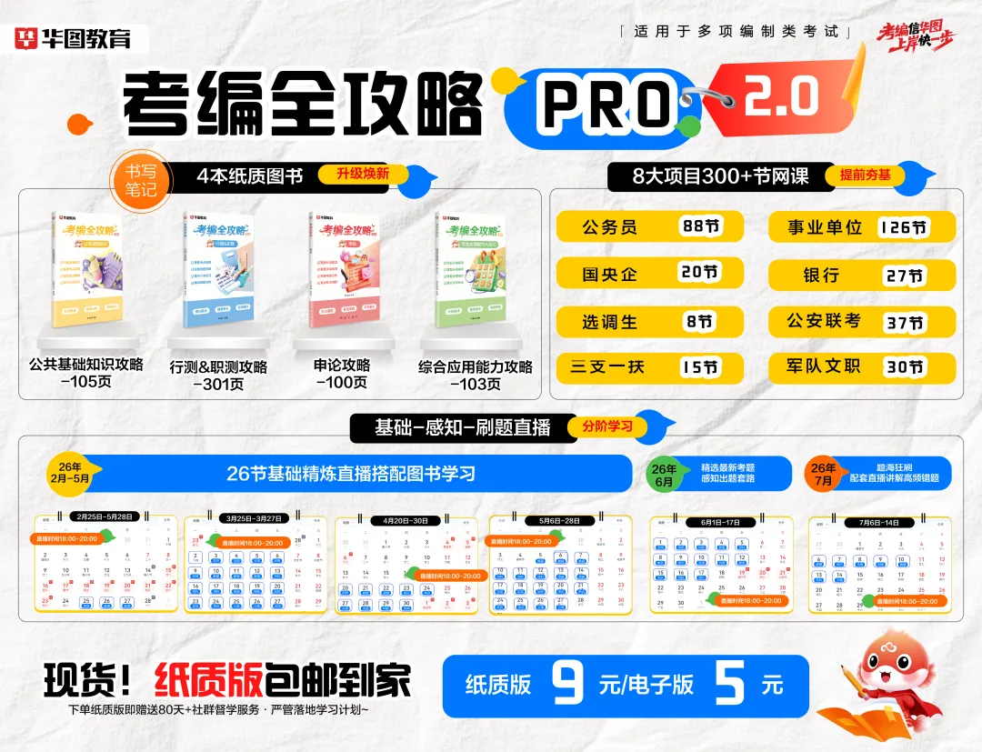 《考编全攻略Pro 2.0》打造“纸质资料+网课+直播”全维度备考体系,无需四处搜集资料,一套搞定全阶段学习: