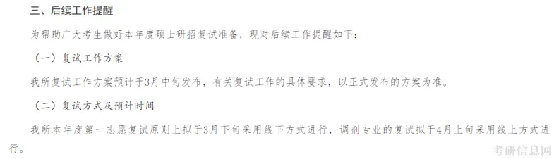 调剂专业的复试拟于4月上旬采用线上方式进行。
