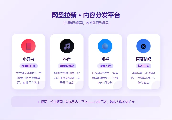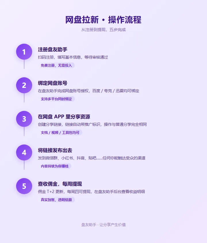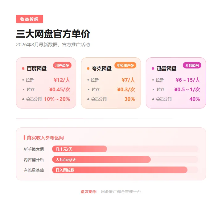 网盘拉新,是指普通人通过分享网盘资源链接,帮助百度网盘、夸克网盘、迅雷网盘等平台获取新用户或促成老用户的资源转存,平台按约定单价支付推广佣金的一种行为这件事既不需要囤货,也不需要开店,更不需要对着镜头讲话用户规模决定广告收入,用户付费率决定会员收入,用户活跃度决定平台估值而通过资源链接来的用户不同—他是因为「想要那份资源」才来的,打开账号就有内容,留存质量更高所以平台更愿意把这笔推广费用让利给真实的分享者,而不是投给效果越来越差的信息流广告网盘拉新本质上是网盘平台把用户增长的成本,分给了每一个帮它传播的人做网盘拉新,收益来自三条线,分开来看会清晰很多第一条:拉新佣金别人通过你的链接下载了网盘APP,并且完成了新用户注册,平台就给你一笔拉新费用已经有网盘账号的老用户,点开你的链接把资源保存到自己的网盘—这叫「转存」,同样给钱需要注意的是:同一个用户,要么触发拉新,要么触发转存,两者不会叠加用户通过你的链接购买了网盘会员,你额外拿到一笔分成会员分佣可以叠加在前两条上—比如一个新用户注册之后购买了会员,你同时拿到拉新费和会员分成网盘拉新的操作路径没有什么隐蔽的环节,完整流程如下:在盘友助手里完成网盘账号的授权绑定,百度/夸克/迅雷都可以绑定绑定完成后,你在网盘里分享的资源链接,会自动带上你的推广标识把你有的资源—文档、视频、图片、工具包—在网盘APP里创建分享链接这个动作和普通分享一模一样,链接本身没有变化,只是后台挂上了你的佣金追踪发到微信群、朋友圈、小红书、抖音、知乎、贴吧—任何你能触达受众的地方只要有人点进来保存或者下载注册,佣金就计入你的账户同一个资源你可以同时上传到三个网盘,同一批受众在不同平台各有重叠,收益自然就叠起来了网盘拉新不需要你押注在某一个平台上,多平台绑定是降低风险、提高覆盖率的基本操作这个问题每个人问,每个人的答案都不一样—因为变量实在太多了资源质量、发布频率、受众体量、平台算法……任何一个维度拉开,收益差距就会很大内容积累到一定量之后,后台就开始有稳定进账,大几百是普遍水平有流量基础或者专门在做内容的人,单日破四位数不是偶发网盘拉新收益的核心逻辑是时间复利—你今天发的一条内容,三个月后依然在帮你结算佣金等某天你打开后台,发现收益已经安静地涨上去了,那个感觉很难用其他副业复制答:不是,这是百度网盘、夸克网盘、迅雷网盘等平台官方运营的推广体系,佣金由平台直接结算,不存在第三方套路答:注册盘友助手不收费,绑定网盘账号不收费,你唯一需要投入的是「你本来就有的资源」和「发布内容的时间」答:你手边有什么就从什么开始—办公模板、学习资料、设计素材、工具包、视频素材,都可以,不需要特别稀缺,普通实用的资源反而受众更广答:最容易被忽略的一点是资源打包升级—把零散文件整理成分类清晰的合集,用户的保存意愿会显著提升,单次转存从「随手一点」变成「一口气保存二十个文件」,效果完全不一样答:只要有人在用网盘,网盘平台就需要推广,网盘拉新这件事就不会消失,它不是某个风口,而是平台一直在做的常规业务但有一种钱的属性很特别—你不需要在场,它也在帮你运转你做的内容还在,链接还在,每天都有人搜到它,点开它,保存它这不是天上掉钱,是你提前把劳动埋在了某个地方,然后它开始生利息注册后,在「周无限」公众号后台回复【教程】领取完整推广教程