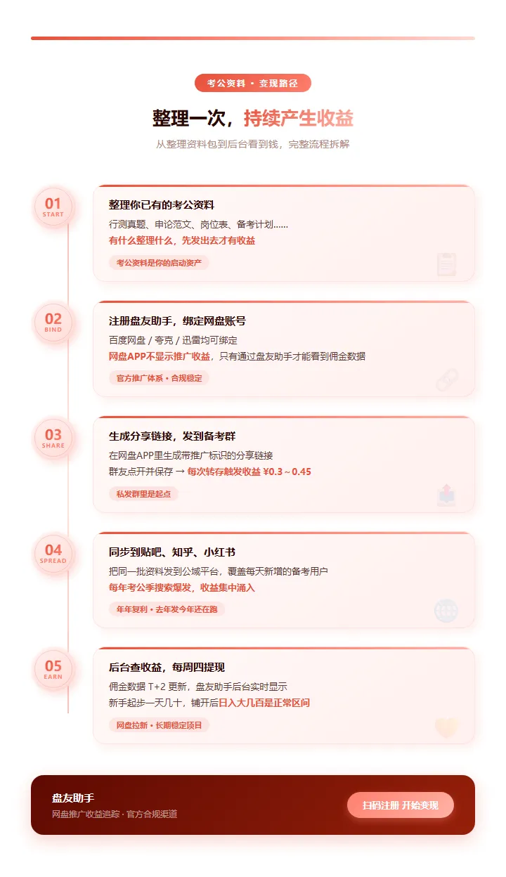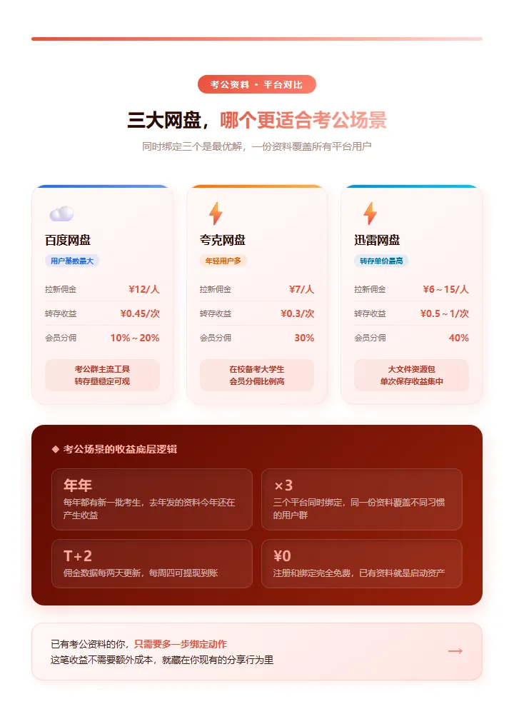 把考公资料放进网盘、发出去分享的那个动作,本身可以产生收入先用一句话给「网盘拉新」一个准确的定义,方便理解后面所有的逻辑:网盘拉新,是网盘平台开放给普通用户的官方推广机制——你帮平台带来新用户或让别人保存你的文件,平台付给你佣金百度网盘、夸克网盘、迅雷网盘,都有各自的推广计划,这不是什么灰色地带,是网盘平台写在官方政策里的商业合作模式,简单说:你发的每一个考公资料包,只要有人通过你的分享链接保存,你就在积累收入二、 平台为什么愿意付这笔钱——一个值得理解的商业逻辑获取一个新注册用户,平台可能要花十几到几十块的广告费他通过你的分享链接点进来、下载了真题合集、顺手注册了百度网盘,平台省了获客成本,你的分享动作得到了量化,这是个双赢的结构网盘拉新的变现路径不止一条,理解这三条收益线,能帮你判断自己能从哪里切入:新用户——之前从来没有用过该平台的人——通过你的分享链接注册了账号,触发一次拉新佣金,已经有该平台账号的老用户,通过你的链接把文件保存到自己网盘,每次触发一笔转存收益,考公资料群里绝大多数人早有百度网盘账号,但这不是问题——老用户每次保存一样给钱通过你的链接注册并购买了会员的用户,额外给你一个比例的分成,注意:同一用户只会触发拉新或转存其中一条,新用户走拉新,老用户走转存,不会叠加网盘APP本身不显示推广数据,你的佣金只能在盘友助手里查看和提现发到备考群、贴吧、知乎、小红书——私发是起点,公域放大是天花板但考公资料有一个特点:每年都有新一批考生进来,你去年发的资料今年还在产生收益五、 三大平台对比:百度、夸克、迅雷,谁更适合做考公场景适合场景:行测真题、申论范文、备考计划表——这类高需求资源在百度网盘的传播效率最高年轻用户渗透率高,移动端体验好,在校备考大学生里用得多,会员分佣高达30%,做长期内容的人收益会越来越稳,适合场景:做备考号、学习博主,积累粉丝后每次发资料都有叠加收益不同用户有不同的网盘习惯,同时覆盖才能不漏掉任何一次保存答:分享资料本身是用户行为,网盘推广机制是平台官方开放的,只要分享的资料来源合规,推广行为完全没有问题要注意的是不要分享官方明确禁止二次传播的版权内容答:百度网盘、夸克、迅雷都是正规平台,推广计划多年运营,收益真实到账盘友助手是聚合推广管理的工具,佣金来自平台的官方营销预算问:考公群里的人大多有百度网盘了,拉新会不会很难?答:拉新只是收益来源之一,老用户的每次转存同样产生收益考公群有几十上百人,每次发资料被批量保存,转存收益才是考公场景里最主要的收入来源答:注册和绑定完全免费,你已经有的考公资料就是启动资产,唯一需要付出的是整理和发布的时间答:这是各大网盘平台的长期推广机制,只要平台在运营,推广计划就在,属于可以长期做的稳定项目需求体量大且集中——每年参加公考的人以百万计,资料需求旺盛,年年复利——今年的真题是明年考生的备考资料,你整理一次,多年受益,传播路径成熟——贴吧、考公论坛、备考群,都是现成的分发渠道,平台和个人利益天然对齐——你越努力整理资料、触达更多考生,平台新用户就越多,你的收益就越高这是「网盘拉新」里少数几个,个人投入和平台收益高度一致的场景注册后,在「盘友助手」公众号后台回复【教程】领取完整推广教程